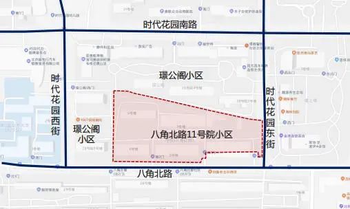 八角北路11号院小区位于八角街道,小区南邻八角北路,东邻时代花园东街,西、北临璟公阁。