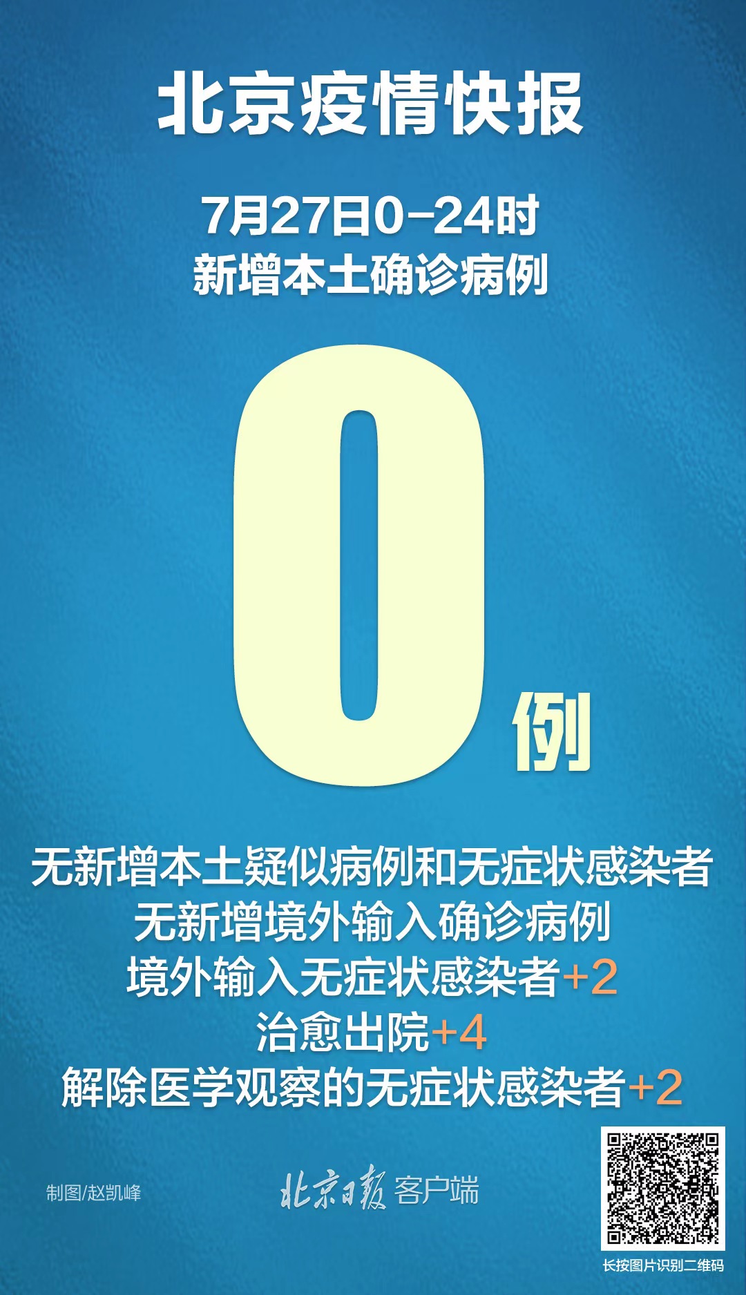7月27日0时至24时,北京无新增本土确诊病例、疑似病例和无症状感染者;无新增境外输入确诊病例、疑似病例,新增2例境外输入无症状感染者。治愈出院4例,解除医学观察的无症状感染者2例。