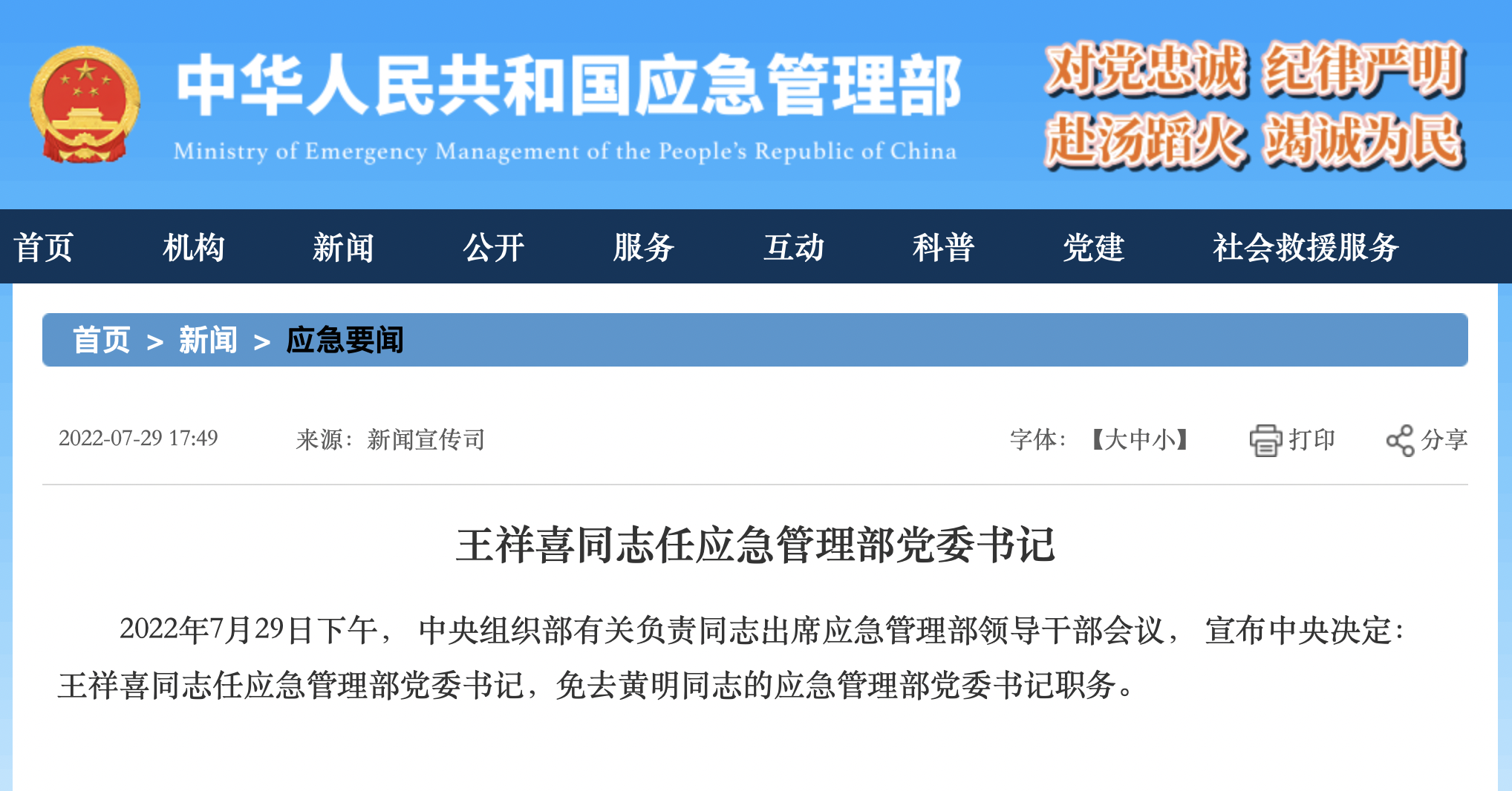 据应急管理部官网消息,7月29日下午, 中央组织部有关负责同志出席应急管理部领导干部会议, 宣布中央决定:王祥喜同志任应急管理部党委书记,免去黄明同志的应急管理部党委书记职务。