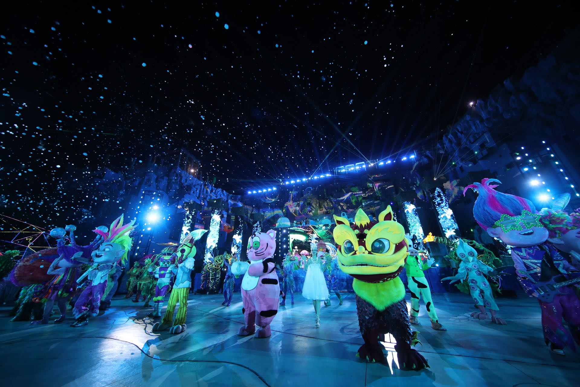 其中,《盖世英雄》城市空间互娱装置体验秀以东方文明展开,上演鼓韵、扇舞、飞天胡旋以及街舞、跑酷杂技特技、火海舞台等十余种表演;《欢乐颂》花车巡游彩车引入了山海经、三星堆、饼干警长、大闹天宫、葫芦兄弟、哪吒闹海等IP。