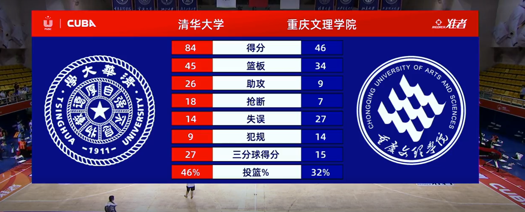 下半场,清华大学外线投篮开始发威,王岚嵚、石奎连续命中三分球。本节结束时,领先优势扩大至26分,比赛就此失去悬念。最终,清华大学84比46战胜对手。