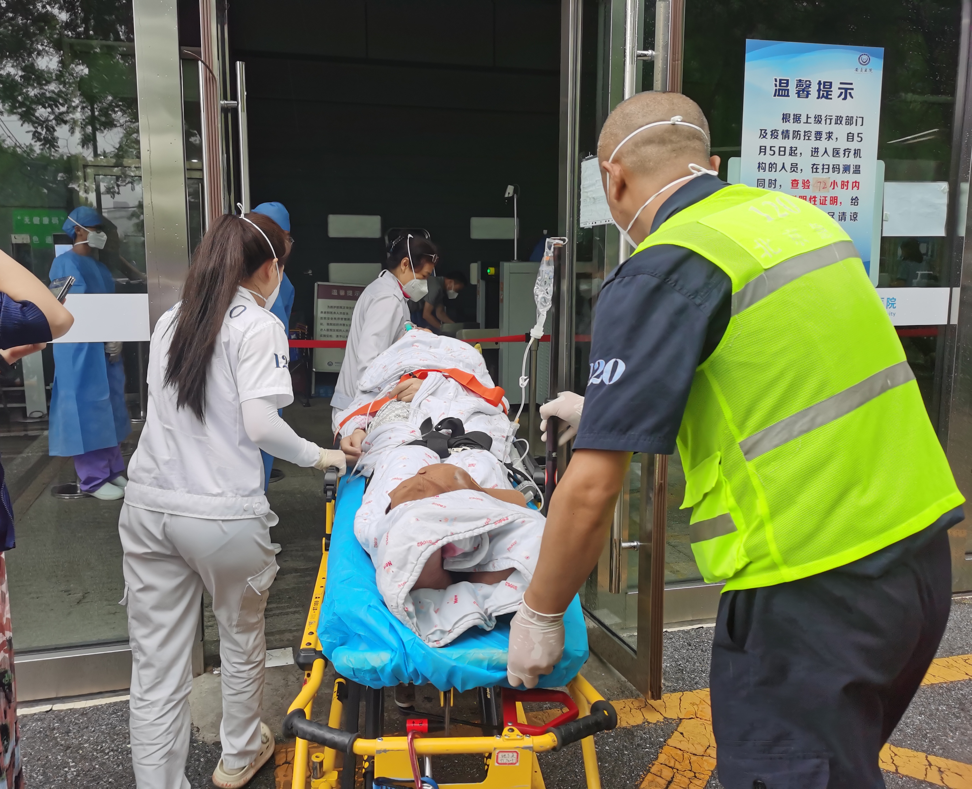 担架推上急救车后,急救车开往距离最近的安贞医院。