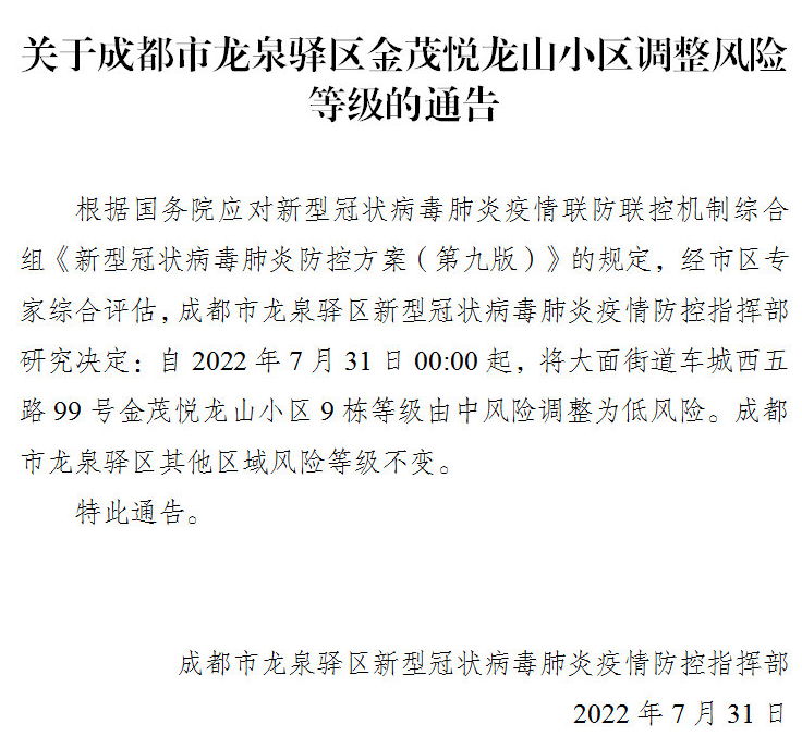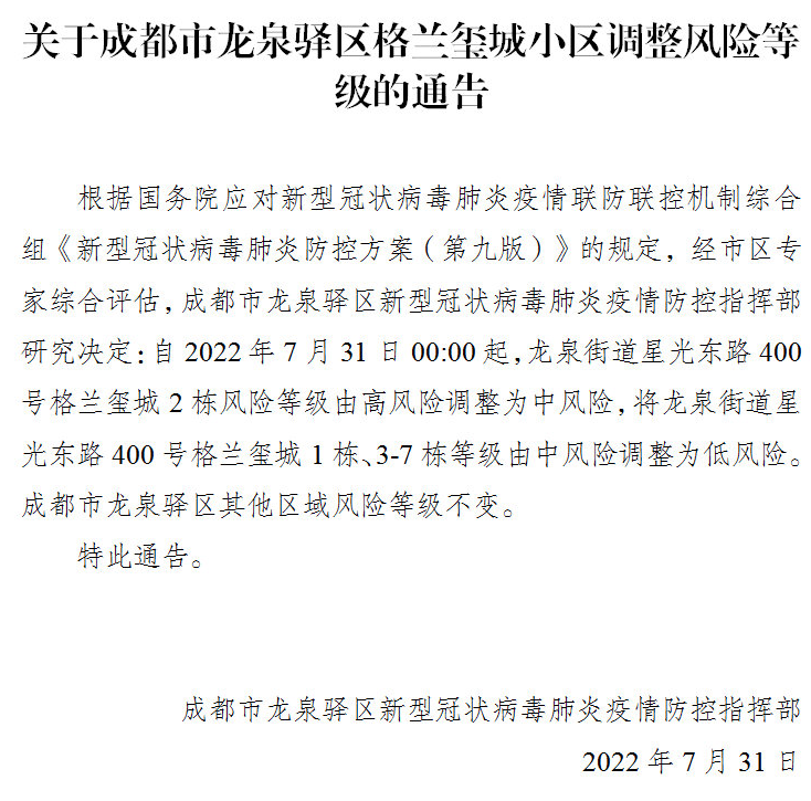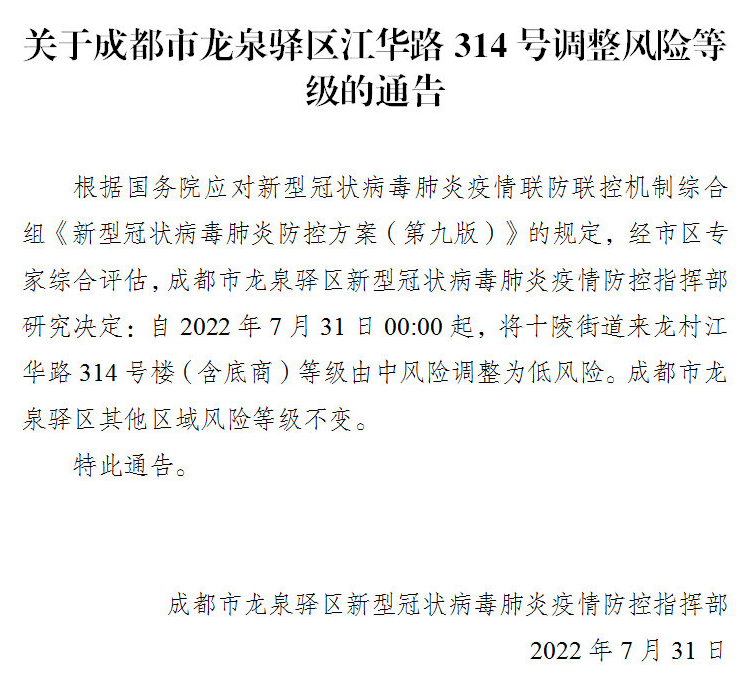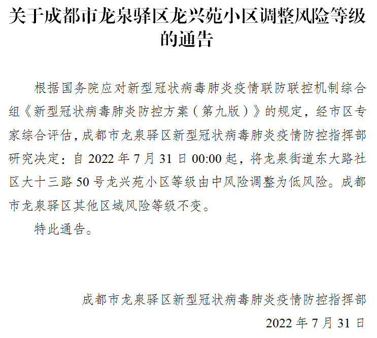 自2022年7月31日0时起,将驷马桥街道马鞍东路19号蜀涛苑1-2栋的风险等级由中风险区调整为低风险区。