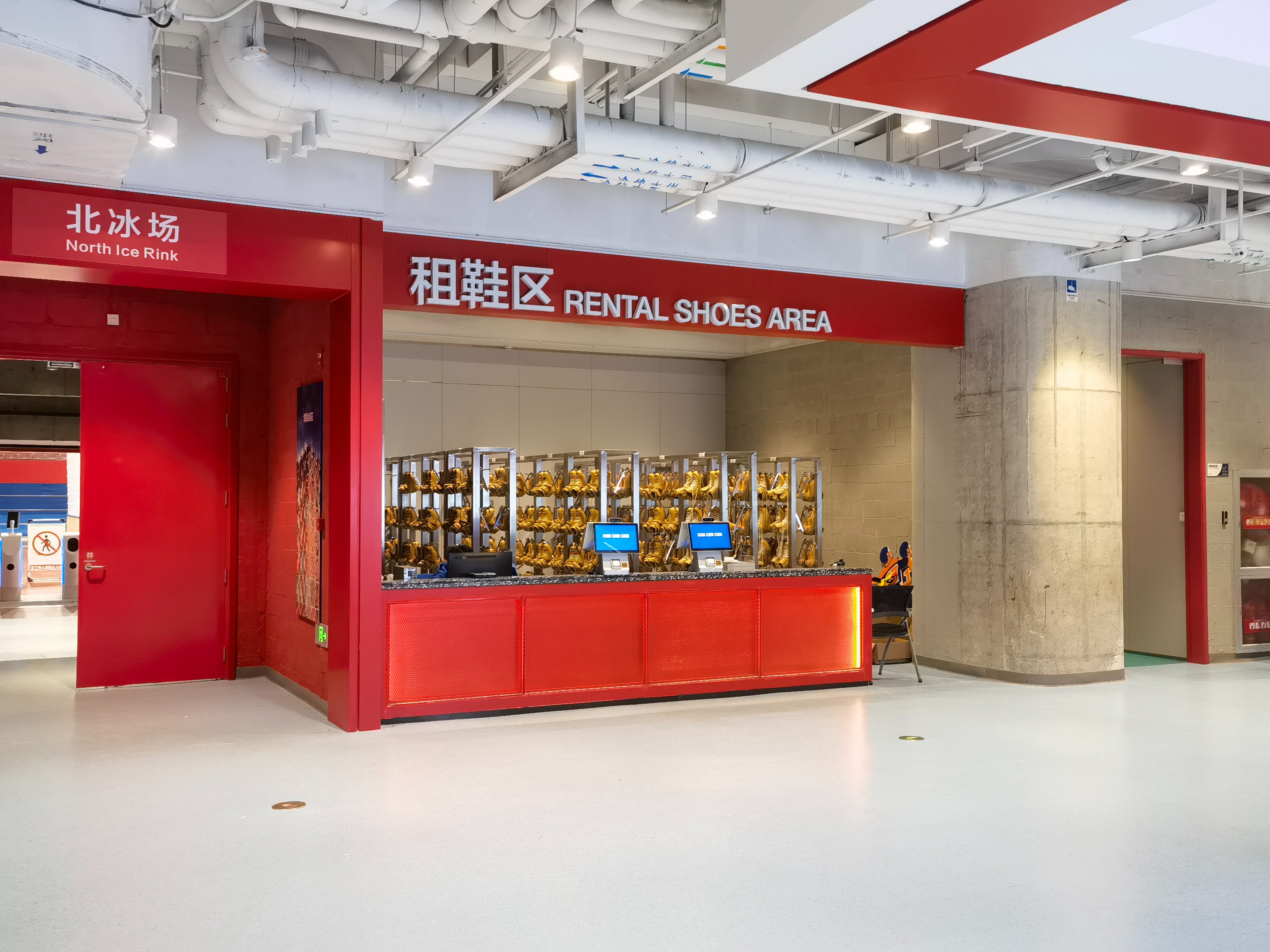 记者乘坐电梯来到冰上中心冰场所在的地下二层。一出电梯,立刻感受到铺面而来的凉爽。在冰鞋租赁区内,全新采购的冰鞋和安全护具有序码放,冰鞋码数从26至44码不等,可满足不同人群需求。赛时供运动员使用的更衣室经过简单改造后也全部开放,游客在这里进行更换装备后,通过入场通道,然后验票,便可上冰体验。
