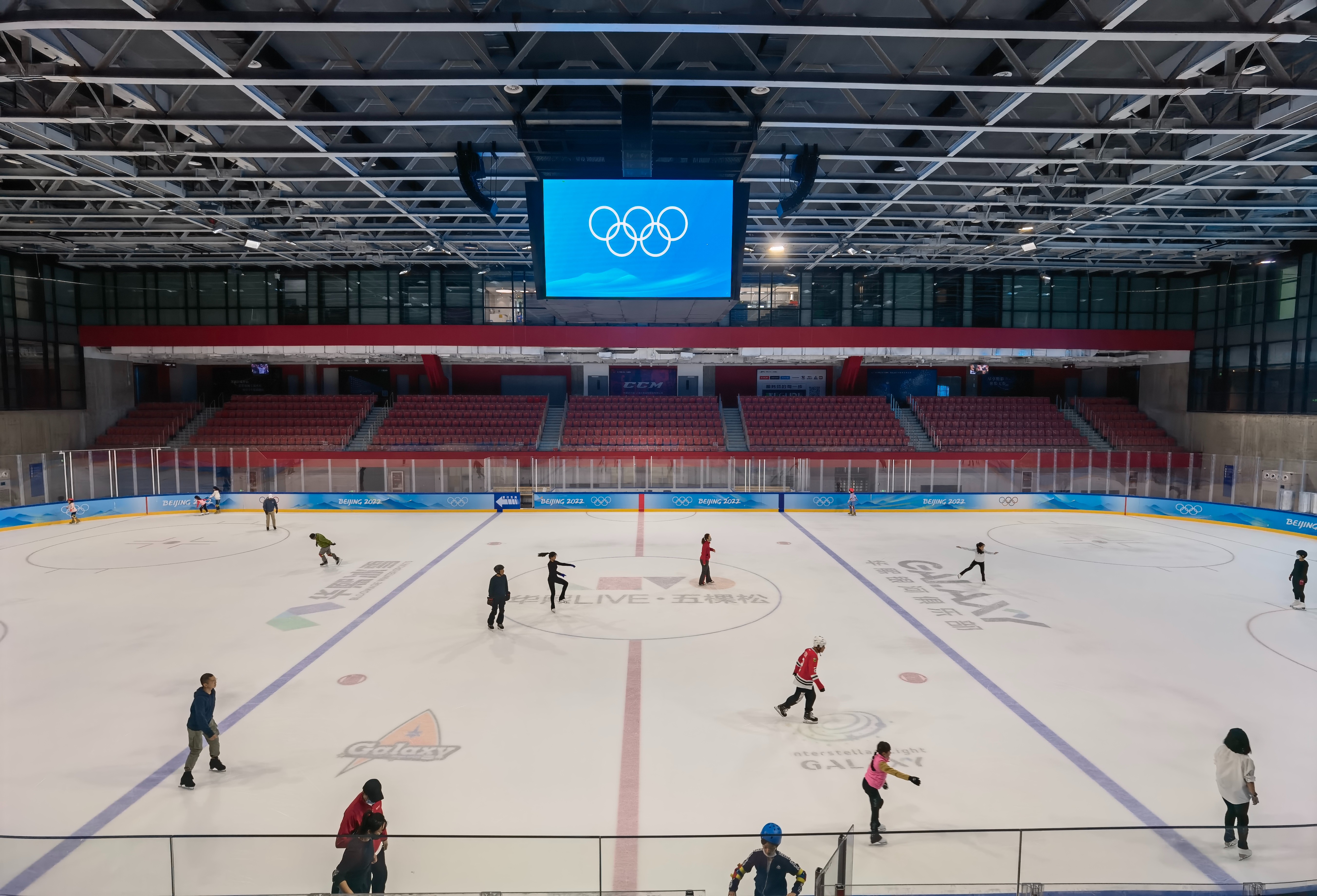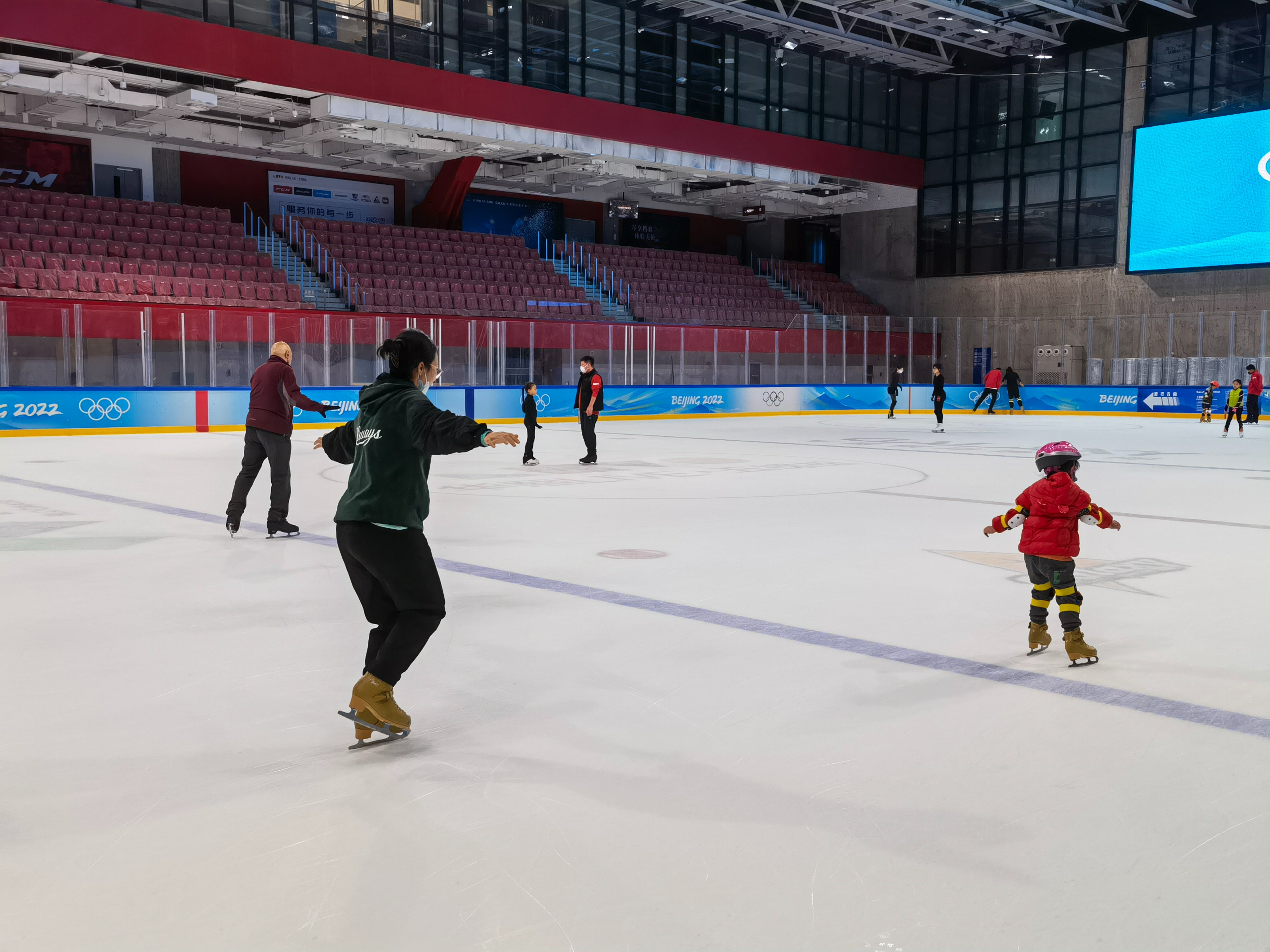 近日,记者来到已经面向公众开放的华熙LIVE冰上中心,现场看到,冬奥赛时供参加冰球比赛运动员热身训练的北冰场一派热闹景象。不少市民正随着动感音乐在冰面上畅滑,看台席上,几位家长拿着手机正给滑冰的孩子拍照。