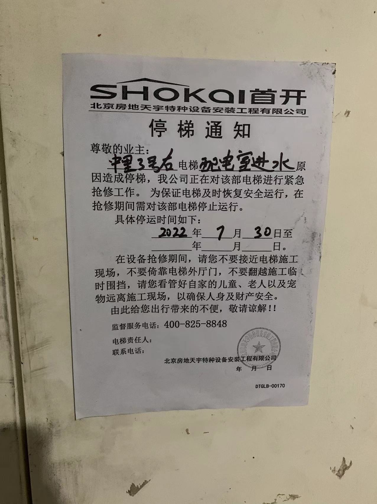 通知上只写明了停运时间为7月30日,未写恢复时间。“上周末两部电梯都坏了,这部电梯是今天中午十一点多刚修好的。”一位居民告诉记者,这栋楼一共22层,住顶层的居民这两天也不知道是怎么过的。