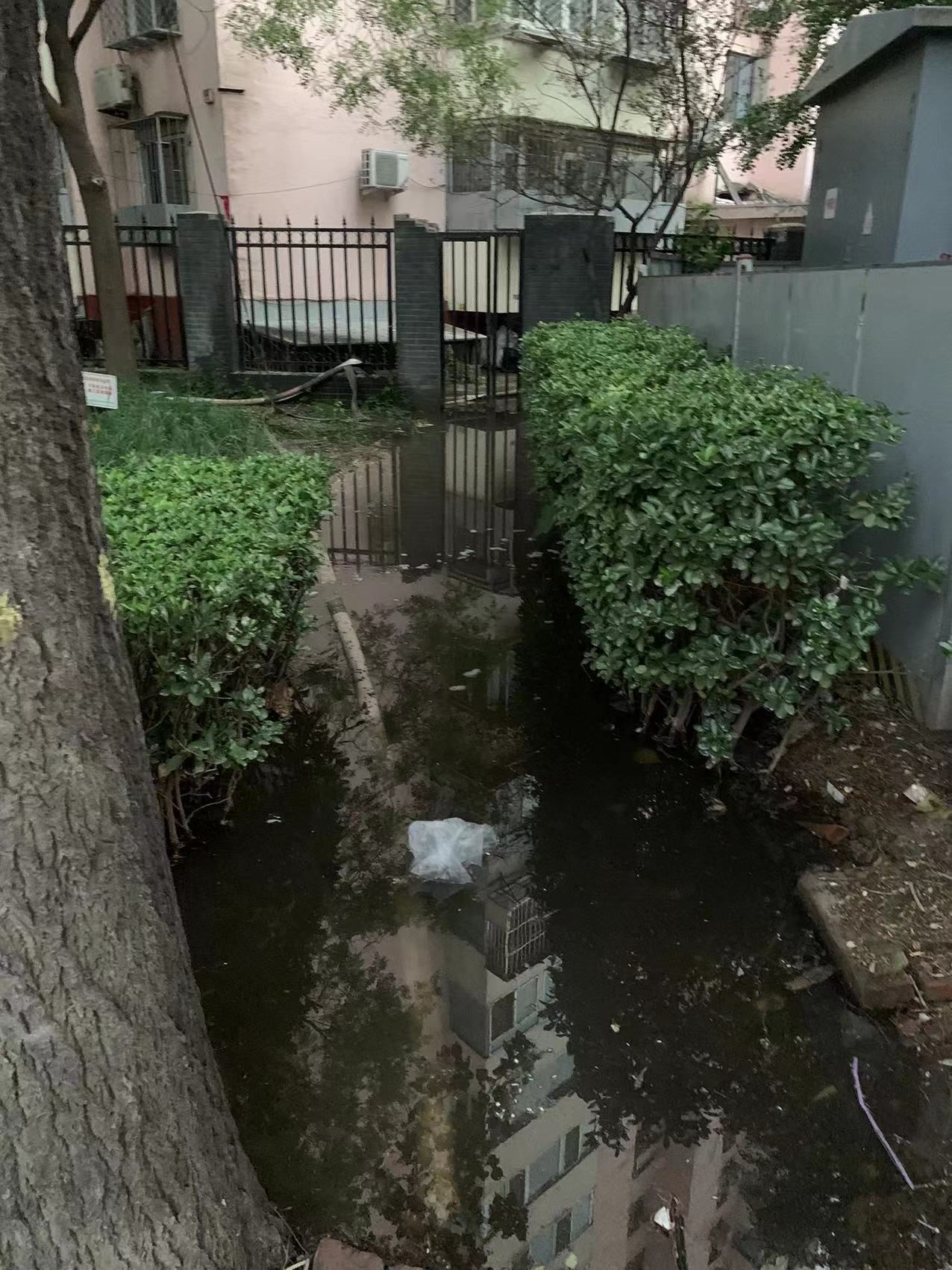 在3号楼北部地下室入口处,记者看到水泵仍在从地下室抽水,水管的出水口则在小区外的草坪上,排出的水源源不断在草坪上铺开,在低矮处形成了约30平方米的水洼,还有不少水溢出草坪,流到人行道上,又沿着人行道流到北三环东路辅路的非机动车道上。