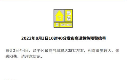 8月2日10时40分,昌平区气象台发布高温黄色预警信号。预计2日至4日,昌平区最高气温将达35℃左右,相对湿度较大,体感闷热,请注意防范。