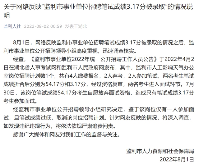 8月1日,一则关于湖北省监利市事业单位被录取人员笔试成绩仅3.17分的消息引发了关注和热议。