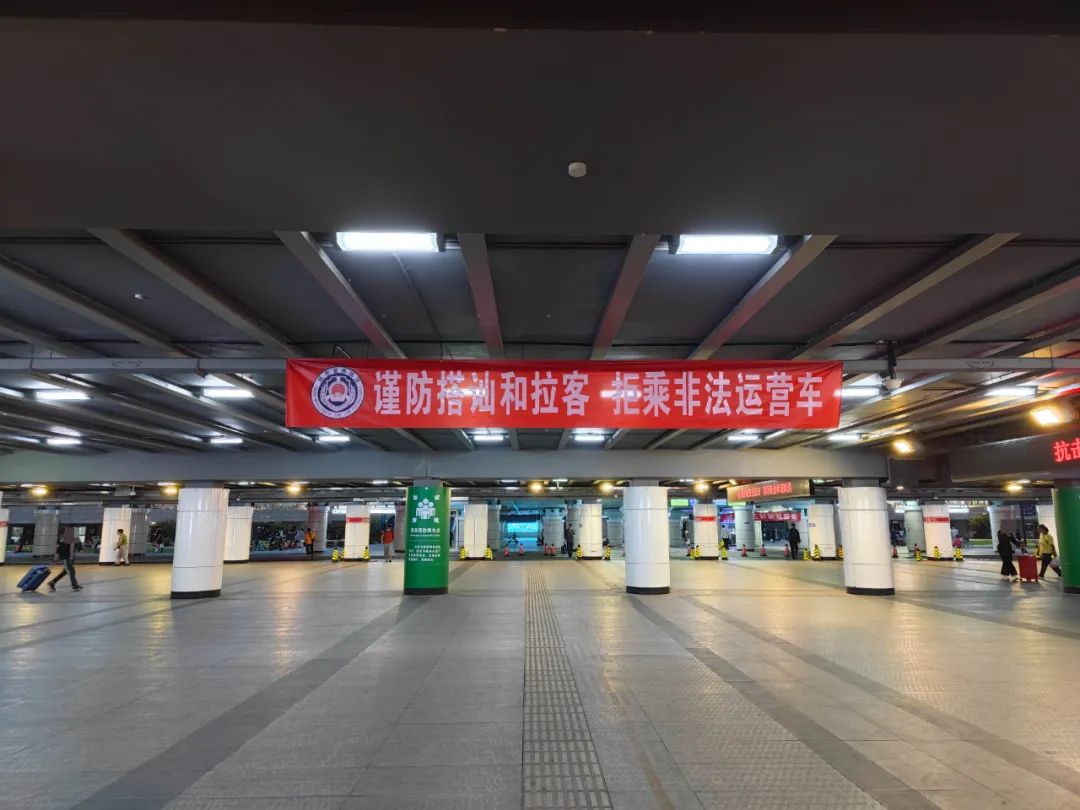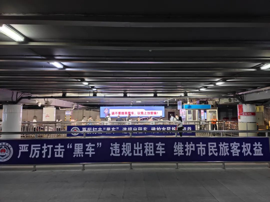 除加大执法监管力度外,大队结合站区的实际情况多措并举巧妙宣传,利用喇叭、广播、LED显示屏等方式播放“拒乘黑车”的宣传内容,避免旅客上当受骗;在出站口、调度站、临时落客区等旅客集中点位附近设置地面投影灯、悬挂醒目的提示横幅,引导群众自觉抵制乘坐非法车辆,营造打击“黑车”非法营运浓厚氛围。