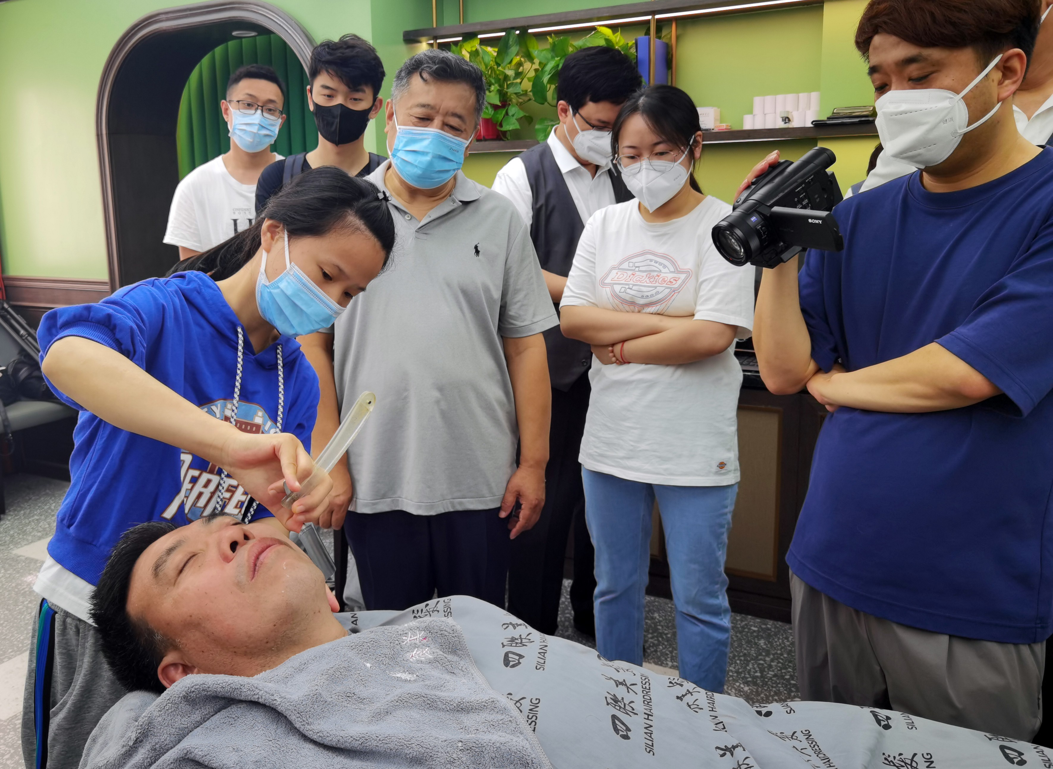 传承是四联美发发展的根本,耿进兴带着年轻人练习刮脸这一非物质文化遗产。