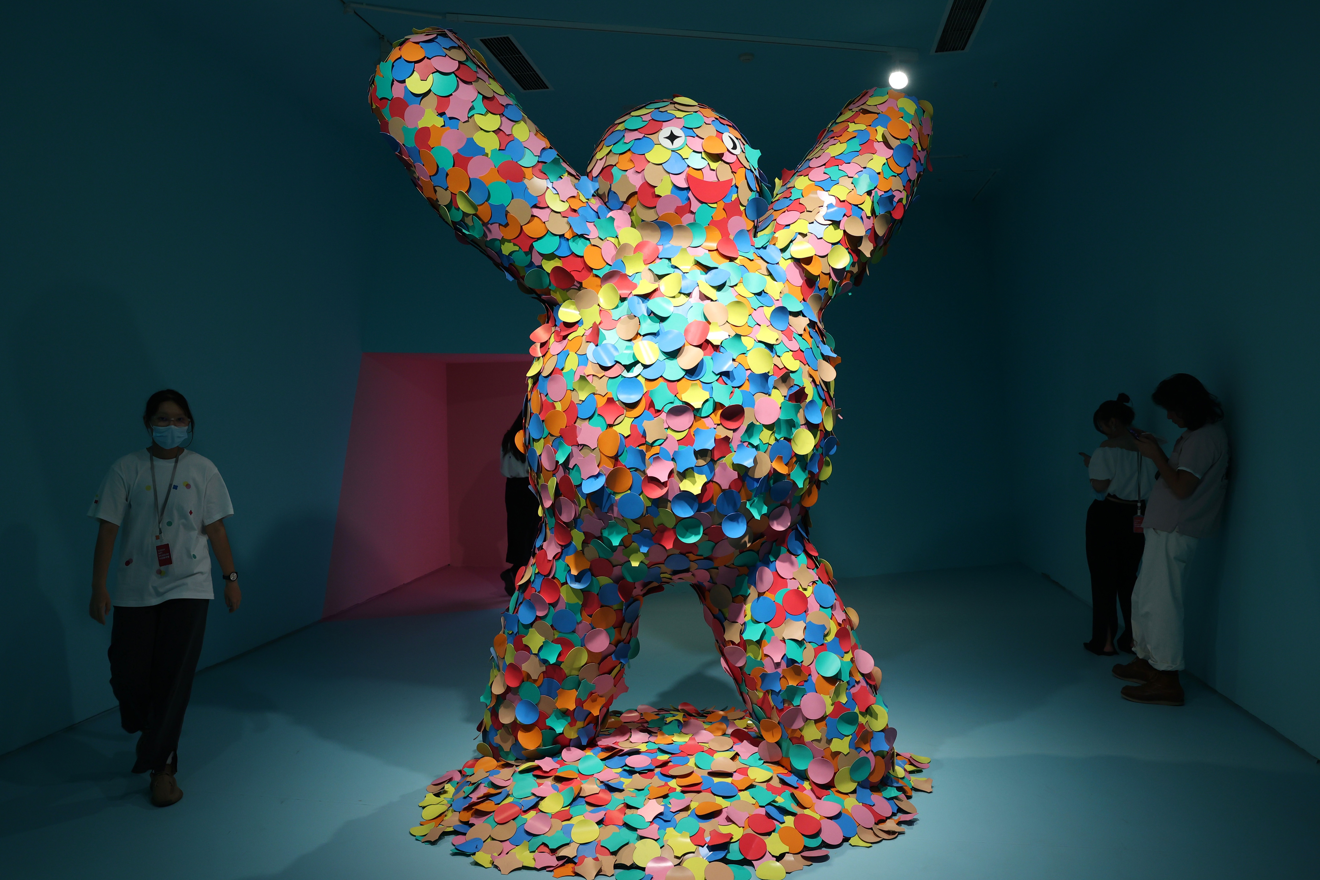 进入中庭展厅,一只长22米高10米、憨态可掬的“老虎宝宝”赫然展现在观众眼前。作为霍夫曼为本次展览特别定制的重磅作品,《生日虎》运用其标志性的放大手法,使用一百多万个气球制作而成,几乎填满了整个展厅空间。据美术馆工作人员介绍,此次展览的多件作品因为体积过大,需要切割锯开,分批进入大门,再在美术馆中进行组装。