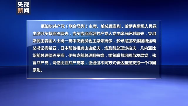 此外,尼泊尔共产党(联合马列)主席、前总理奥利,哈萨克斯坦人民党主席叶尔特斯巴耶夫,吉尔吉斯斯坦共产党人党主席马萨利耶夫,突尼斯民主爱国人士统一党中央委员会主席朱姆尔,多米尼加左派团结运动总书记梅希亚,日本前首相鸠山由纪夫,埃及前总理沙拉夫,几内亚比绍前总理德巴罗斯,伊拉克前总理阿拉维,缅甸联邦巩固与发展党,秘鲁共产党,哥伦比亚共产党等,也通过不同方式表达坚定支持一个中国原则。