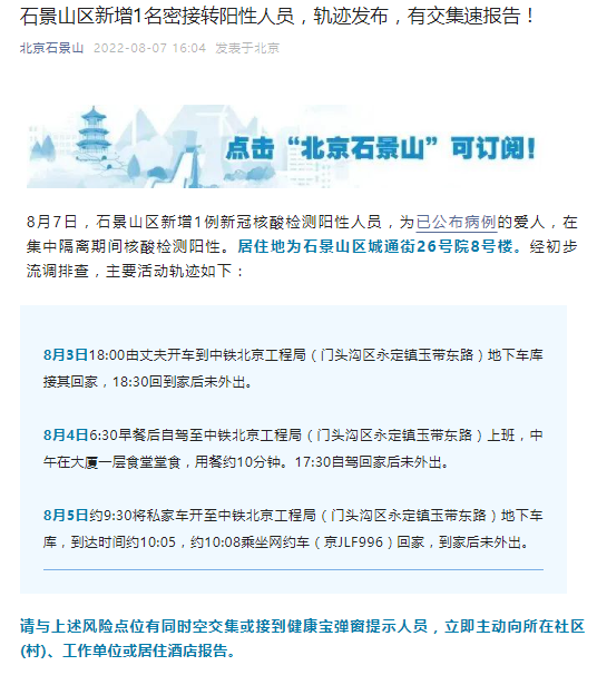 8月7日,石景山区新增1例新冠核酸检测阳性人员,为已公布病例的爱人,在集中隔离期间核酸检测阳性。居住地为石景山区城通街26号院8号楼。经初步流调排查,主要活动轨迹如下: