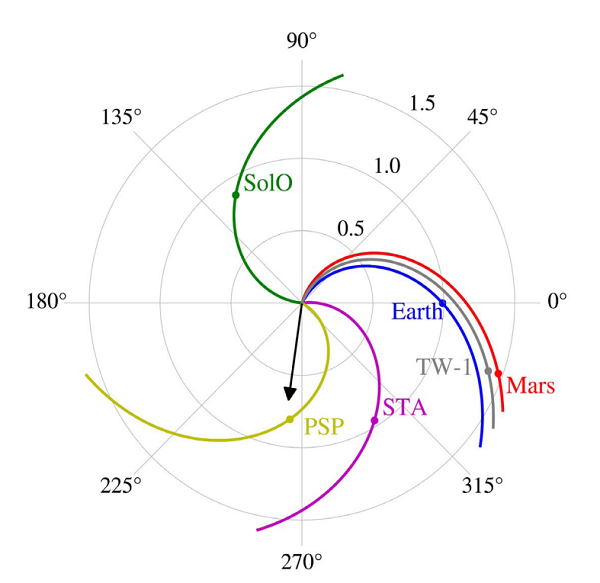 火星能量粒子分析仪是我国首个用于研究行星际和近火星空间辐射环境的载荷。2020年11月29日,火星能量粒子分析仪在地火转移轨道距太阳1.39天文单位处,观测到第25个太阳活动周期的首个大型径向分布的太阳高能粒子事件。事件发生时,“天问一号”与地球近似处于同一根磁力线上,使得“天问一号”和地球附近航天器能相隔数千万公里观测到来自相同源区的太阳高能粒子,为探究太阳高能粒子沿磁力线在行星际空间的传播提供了宝贵的机会。