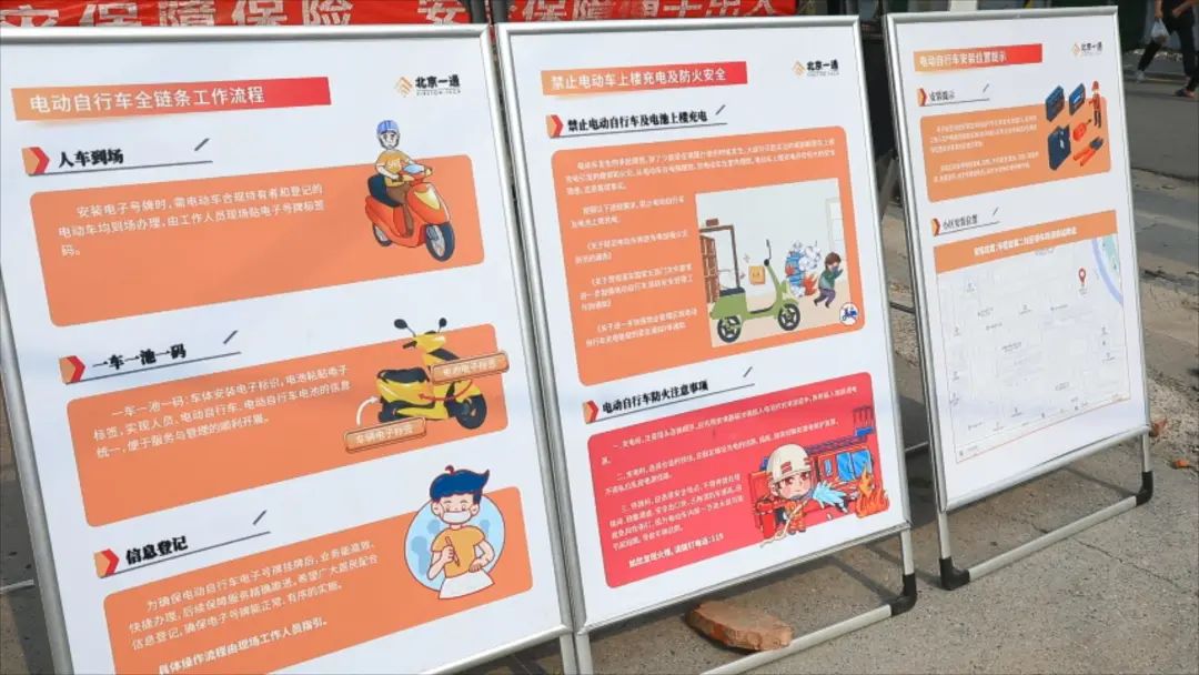 在田村路半壁店第二社区东门内,记者看到,工作人员通过易拉宝向前来赋码的居民讲解电动车的全链条工作流程,科普电动车入户充电的危害。