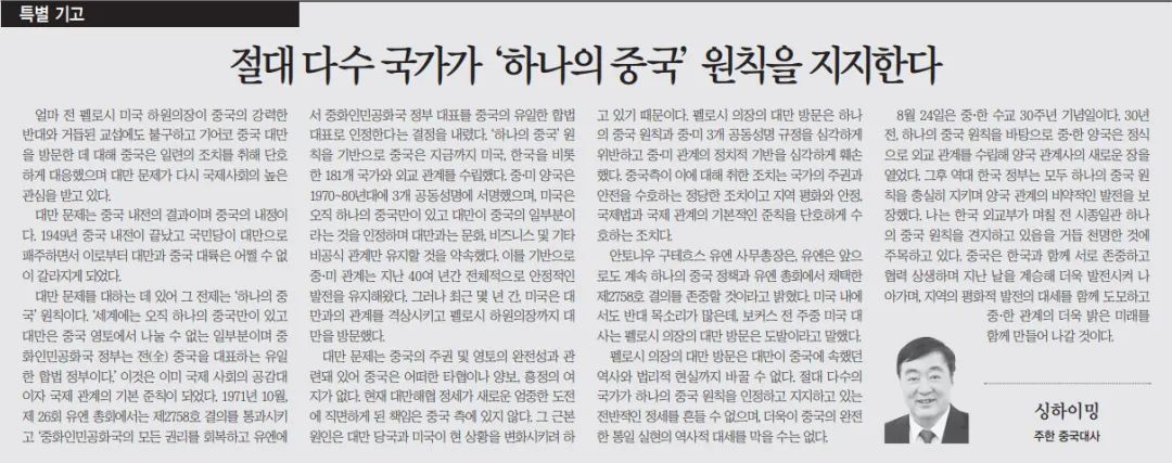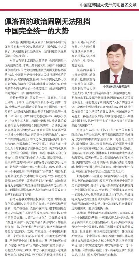 8月9日,邢海明大使在韩国《亚洲日报》《亚洲经济》同时以中韩文发表题为《佩洛西的政治闹剧无法阻挡中国完全统一的大势》的署名文章,就美国国会众议长佩洛西窜访台湾阐明严正立场,详细解读台湾问题历史经纬和现实情况。全文如下: