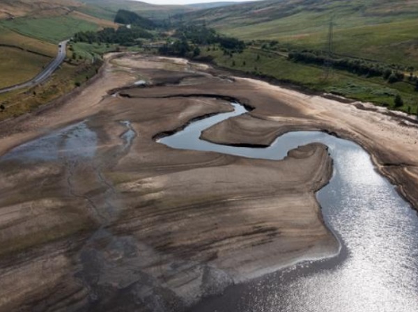这是7月19日在英国曼彻斯特附近拍摄的几近干涸的伍德黑德水库(无人机拍摄)。图源:新华社