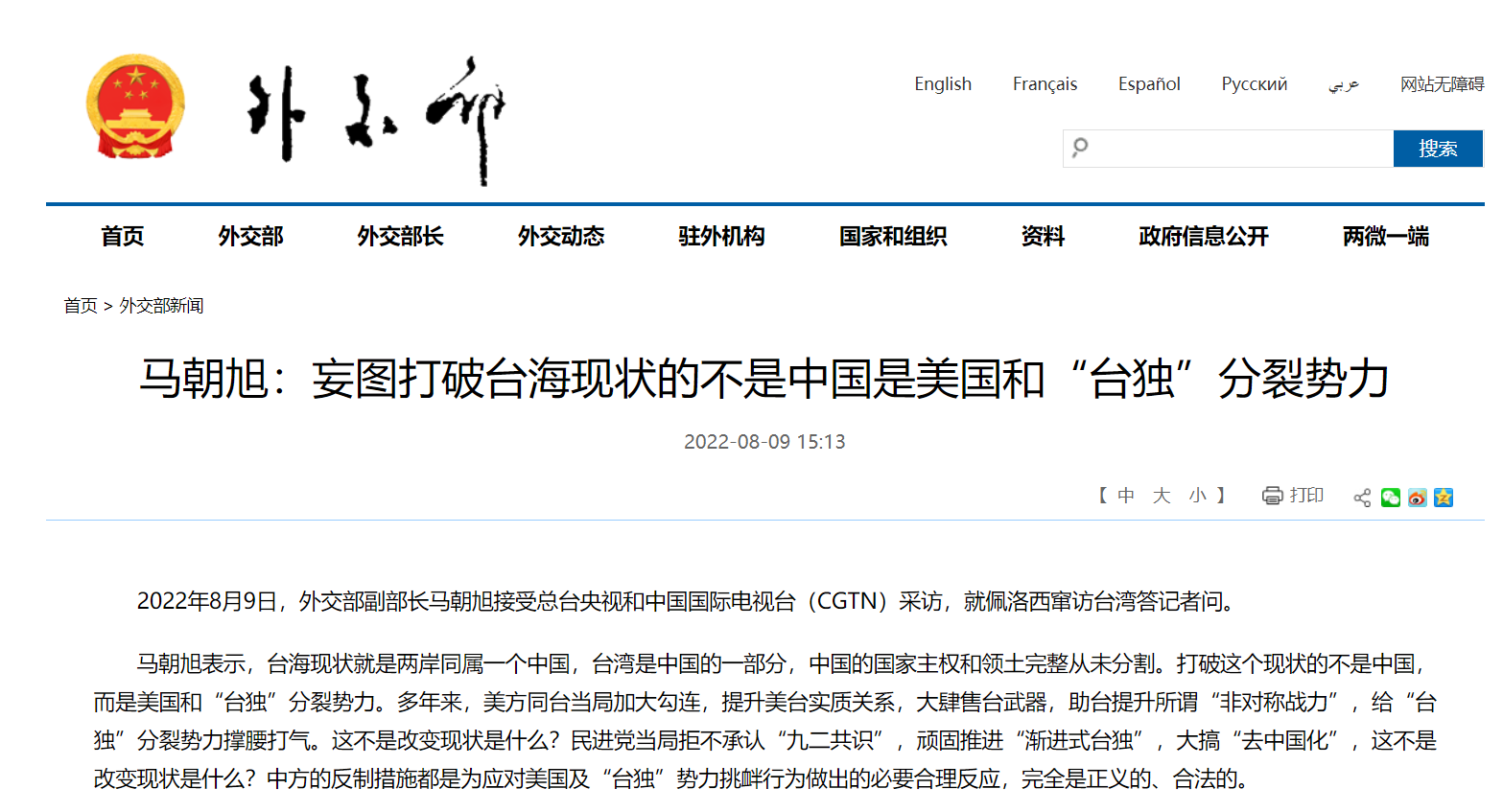 2022年8月9日,外交部副部长马朝旭接受总台央视和中国国际电视台(CGTN)采访,就佩洛西窜访台湾答记者问。