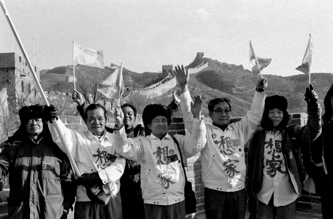 ▲ 1988年1月20日,由台湾“外省人返乡探亲促进会”组织的第一个台湾返乡探亲团身穿印着“想家”的上衣,登上了八达岭长城。