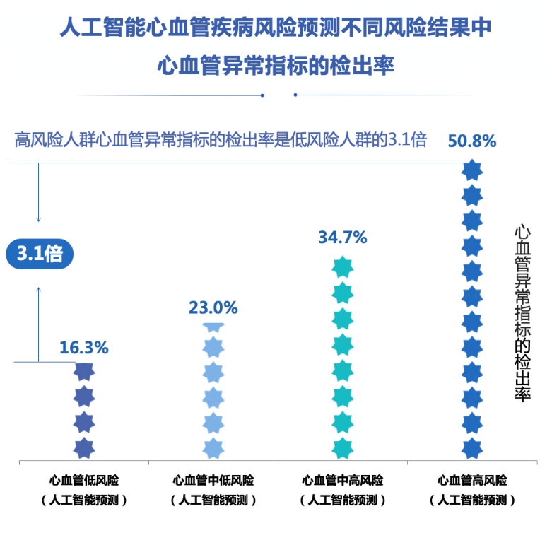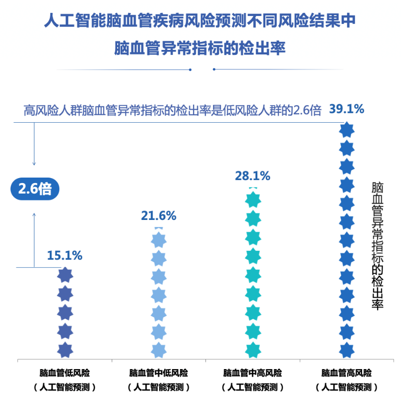人工智能除了精准发现眼底异常外,对慢病风险的评估也同样出色。本次蓝皮书首次加入了心脑血管疾病、糖尿病、高血压、贫血等风险评估,其中人工智能预测心血管高风险的检出率为50.8%,脑血管高风险的检出率为39.1%,需要重点关注。