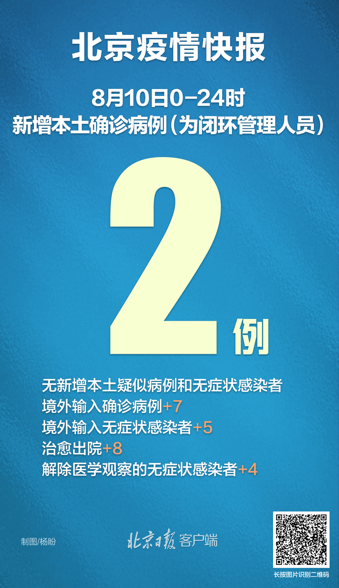 8月10日0时至24时,新增2例本土确诊病例(为闭环管理人员),无新增疑似病例和无症状感染者;新增7例境外输入确诊病例和5例无症状感染者,无新增疑似病例。治愈出院8例,解除医学观察的无症状感染者4例。
