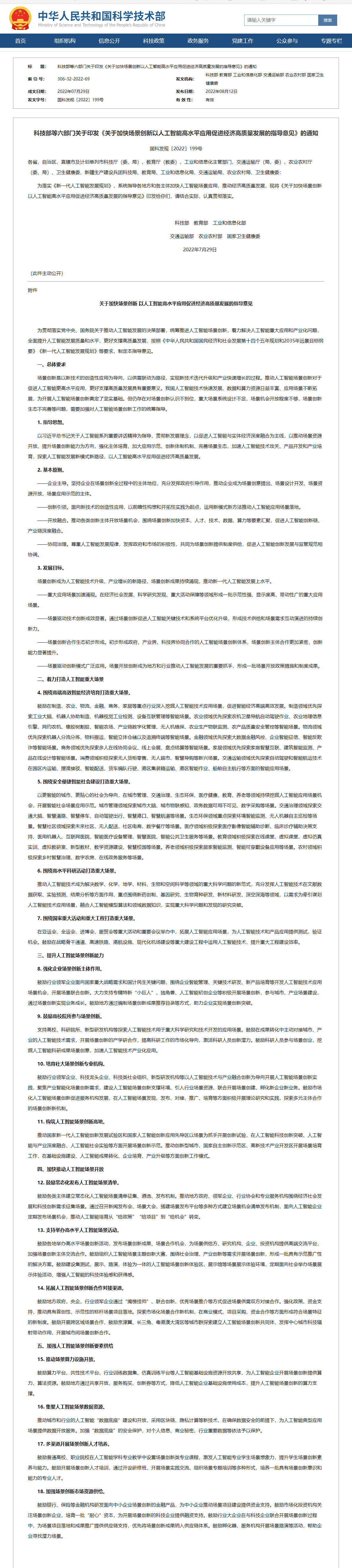据科技部网站消息,科技部、教育部、工业和信息化部、交通运输部、农业农村部、国家卫生健康委等六部门印发《关于加快场景创新以人工智能高水平应用促进经济高质量发展的指导意见》。《指导意见》提出,着力打造人工智能重大场景。提升人工智能场景创新能力。加快推动人工智能场景开放。鼓励常态化发布人工智能场景清单,支持举办高水平人工智能场景活动,拓展人工智能场景创新合作对接渠道。加强人工智能场景创新要素供给。推动场景算力设施开放,集聚人工智能场景数据资源,多渠道开展场景创新人才培养,加强场景创新市场资源供给。