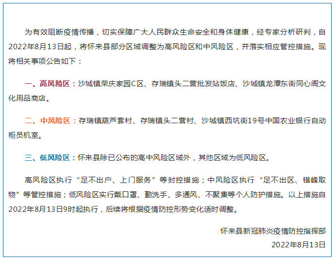 怀来县发现3例新冠肺炎无症状感染者,系8月12日从新疆来怀人员。各小区(村)实行静默管理。部分区域调整为高风险区和中风险区。