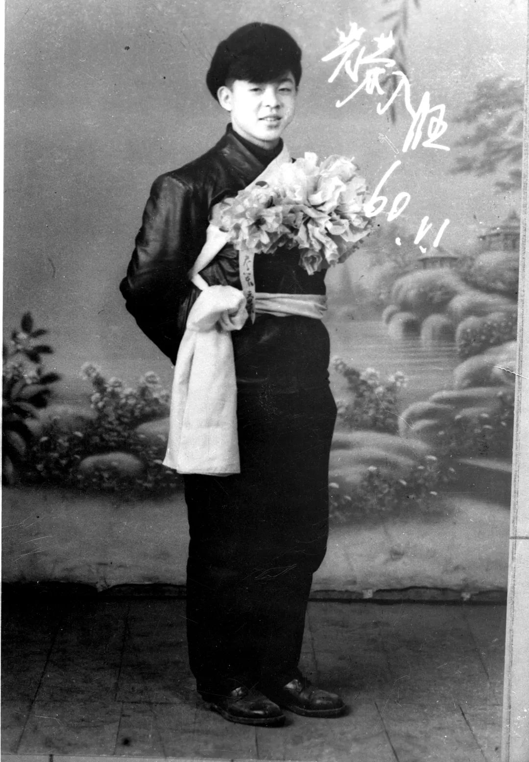 1960年元旦,入伍前的雷锋身着便装披红戴花留影