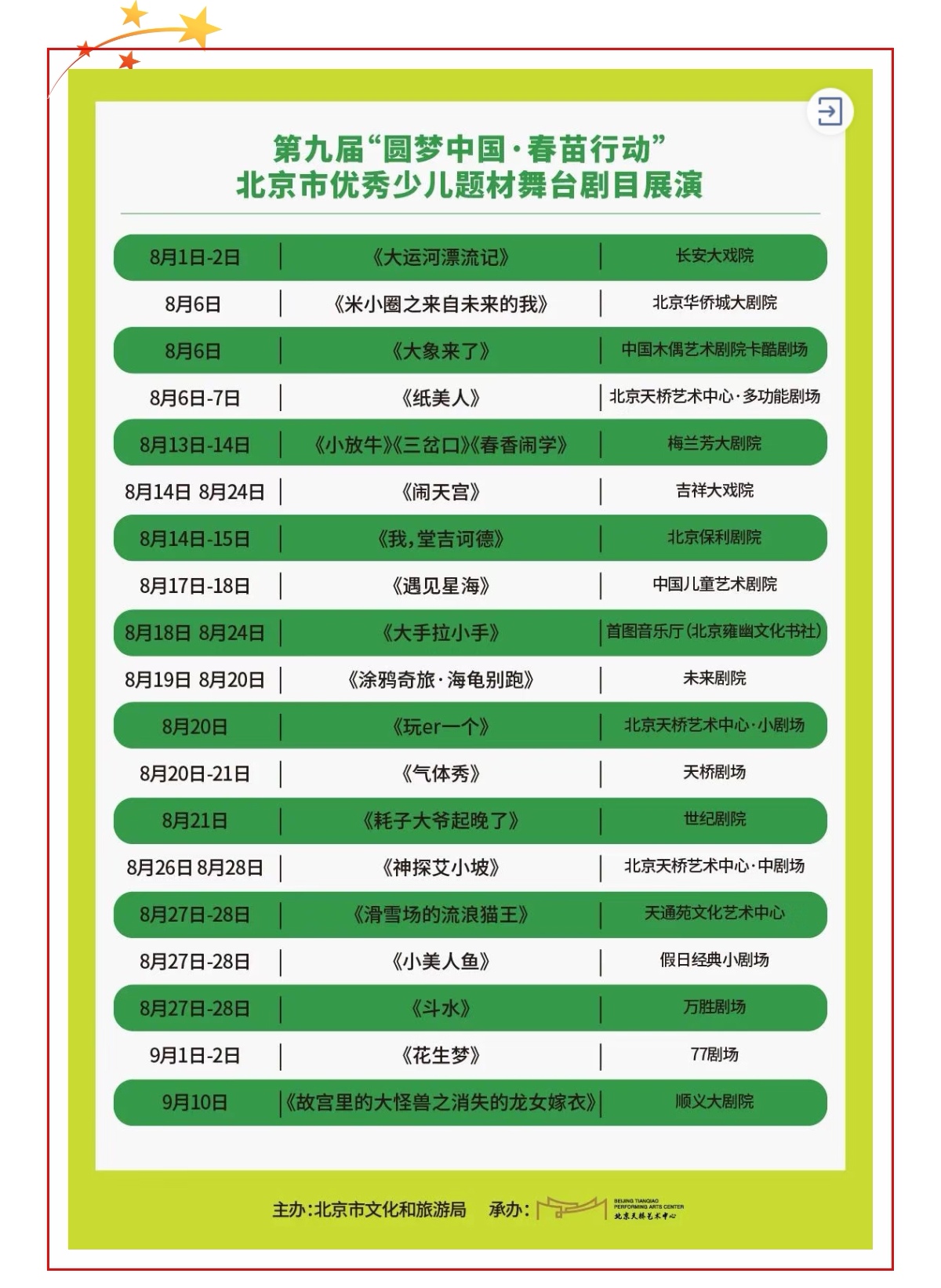 “中外佳作 暑期必看”单元包括北京儿艺儿童剧《耗子大爷起晚了》、音乐儿童剧《滑雪场的流浪猫王》、七幕人生音乐剧《我,堂吉诃德》少年版、中国儿艺儿童剧《小美人鱼》、音乐剧《故宫里的大怪兽之消失的龙女嫁衣》、音乐剧《神探艾小坡》等。