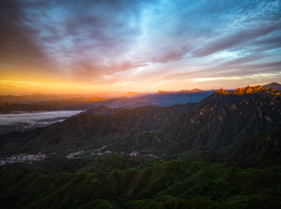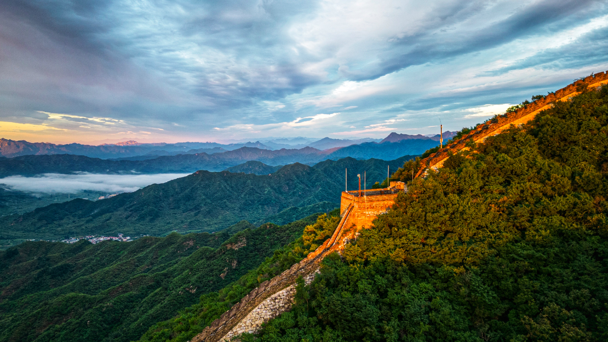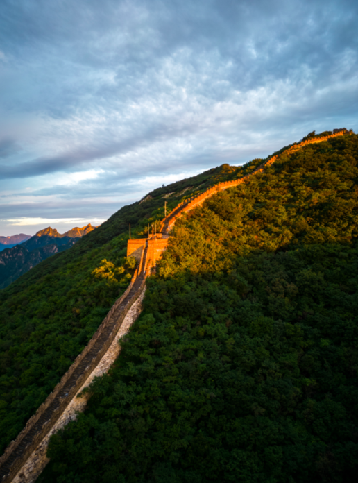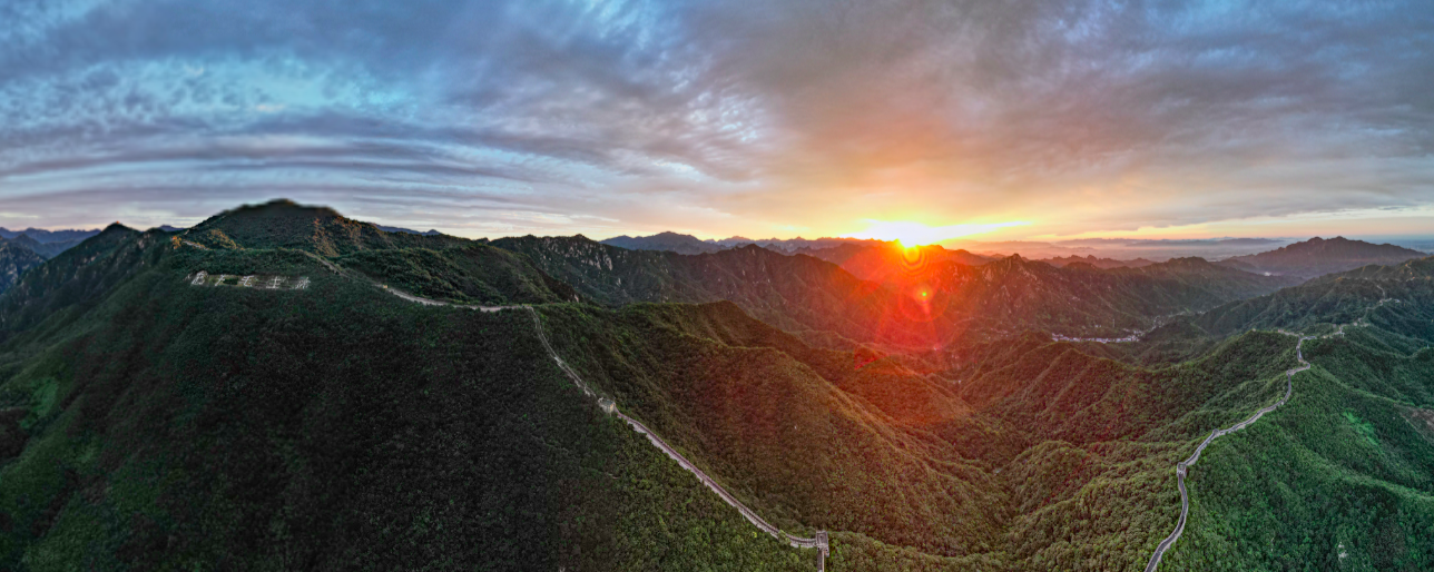 清晨,怀柔区渤海镇的慕田峪长城被初升的阳光涂上了一抹金黄色。绵延不绝的慕田峪壮观、巍峨、婉转的线条,在阳光金、清晨蓝、森林绿的配色下,平添了一身“艺术气质”。