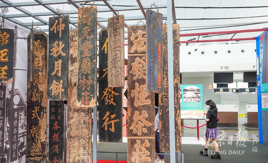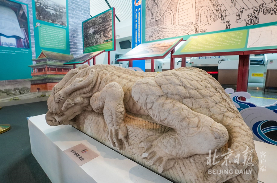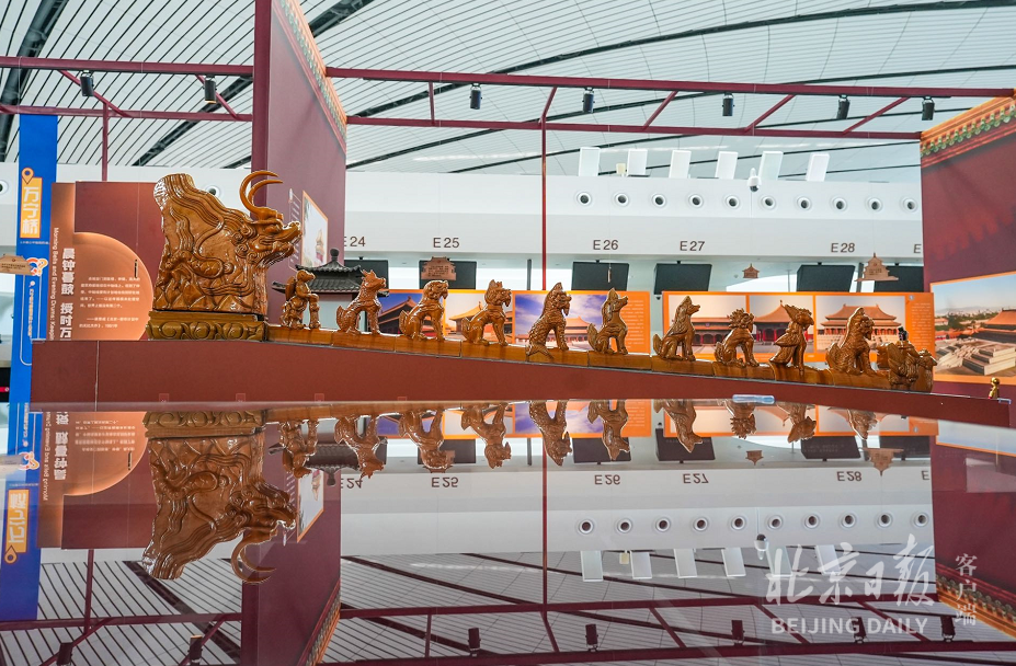 前门老字号商户招牌林立、太和殿屋顶造型各异的檐角脊兽、后门桥下敦实的镇水兽……这些中轴线上的北京印记,一齐跑进了大兴机场航站楼里。