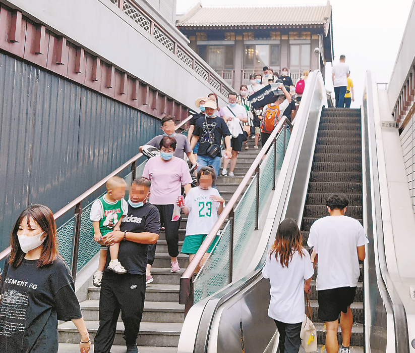 8月13日,记者首先来到地铁8号线什刹海站A2口,从地铁负一层前往地面,原本有楼梯和扶梯可供选择,但是扶梯没有运行,上面遍布灰尘,也没有施工围挡或者相关通知显示停运具体的原因。由于当下正值暑期,前往周边什刹海景区的游客很多,大家都只能从楼梯上下。其中,有的游客抱着婴儿车,小心翼翼走下台阶;还有的游客把看起来很重的行李箱扛在肩上,只能爬着楼梯前往地面。遇到瞬时人流量较大时,如果有携带大件物品的乘客走在并不宽敞的楼梯上,非常不方便,甚至一度寸步难行。