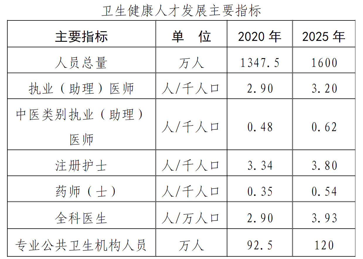 发展规划公布了卫生健康人才发展主要指标,即计划到2025年,全国卫生健康人员总量达到1600万人,每千人口执业(助理)医师数达到3.2人(其中中医类别0.62人)、每千人口注册护士数达到3.8人、每千人口药师(士)数达到0.54人,每万人口全科医生数达到3.93人,专业公共卫生机构人员数增长到120万人。