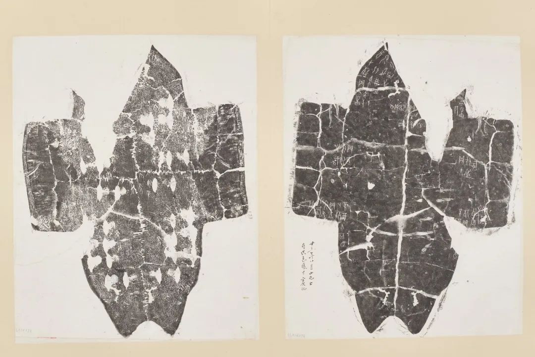 展览中的《商·大龟板》,为“甲骨四堂”(指中国近代四位研究甲骨文的著名学者)之一、甲骨学家董作宾的旧藏。他曾于1928年至1934年八次主持、参与殷墟发掘。正面拓本左下有董作宾题记一行“廿五年八月小屯出,有填色腹甲,宾记”,可知该件甲骨为商代晚期重大国事之卜辞。