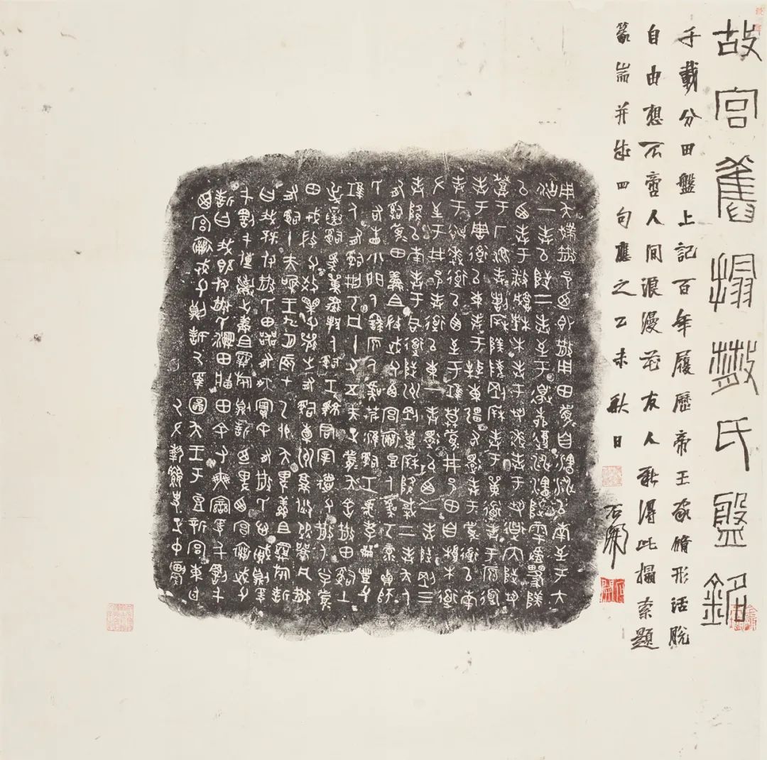 现藏于台北故宫博物院的西周散氏盘,是研究西周土地制度的重要史料。展览展出的散氏盘拓本,为民国时期故宫博物院传拓。同样现藏于台北故宫博物院的西周毛公鼎,是传世铭文最长的一件青铜器,清道光二十三年(1843)出土于陕西岐山,陈介祺旧藏,此次展出的拓本上有陈陔钤印,而陈陔正是陈介祺之孙。从拓本中,观众可以欣赏铭文笔法的圆润精严,线条的浑凝拙朴。