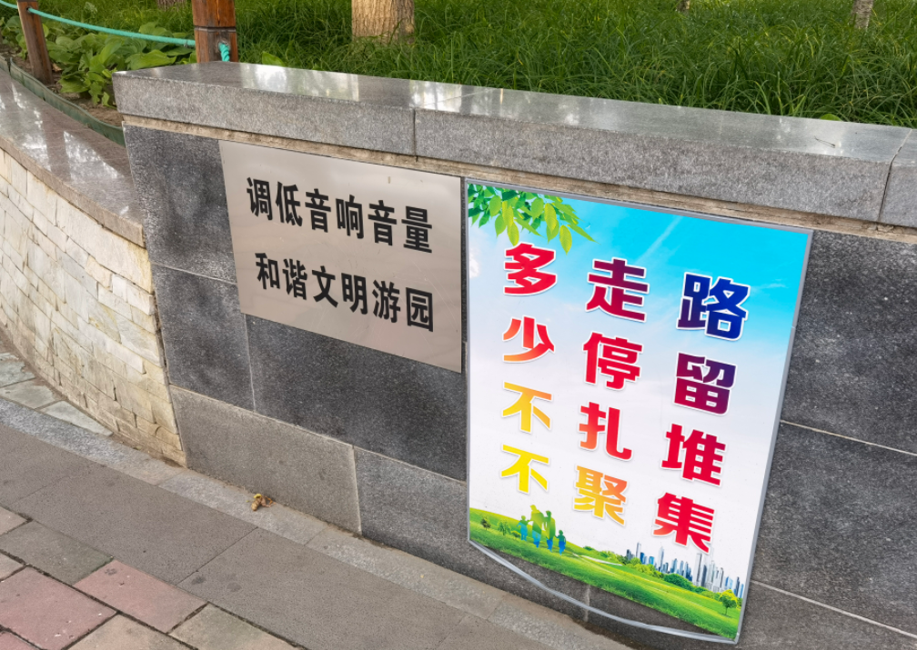 “有半个月了,之前是因为疫情才安装的围栏,防止大家聚集、唱歌扰民,后来就一直这样了。”一位居民说。在公园内不少地方,都张贴着提示牌,提示大家“多走路、少停留、不扎堆、不聚集”、“调低音响音量、和谐文明游园”。