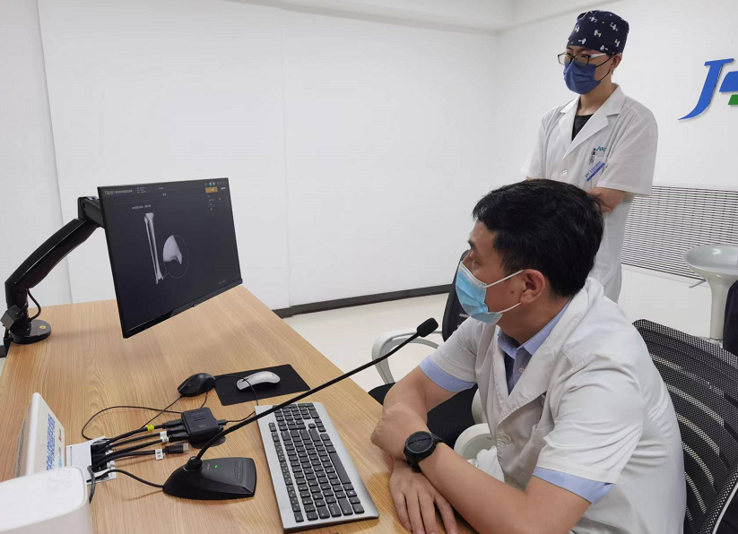 68岁的李女士右膝关节疼痛10余年,加重伴活动受限1年,诊断为右膝骨性关节炎。前期,银川国龙骨科医院术前采集了患者三维影像数据,周一新基于患者术前3D骨模型完成个性化手术方案制定。