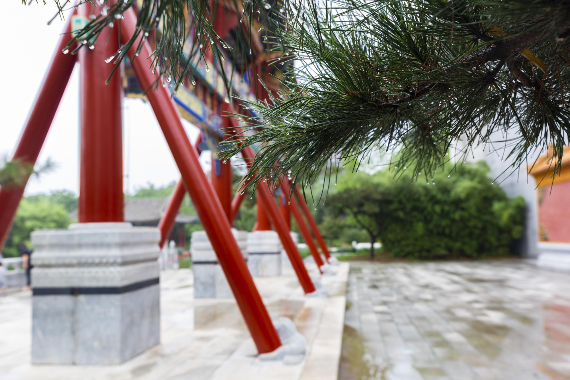 潇潇暮雨洒落湖面泛起阵阵涟漪,骤雨停歇,经过一番雨洗的园林处处都透着一股凉意,地面上铺满了被雨水打落的枝叶,花枝也在秋雨的打压下折了腰身。若是此时撑着伞于细雨秋风中游园,便可观赏到不一样的园林景色。