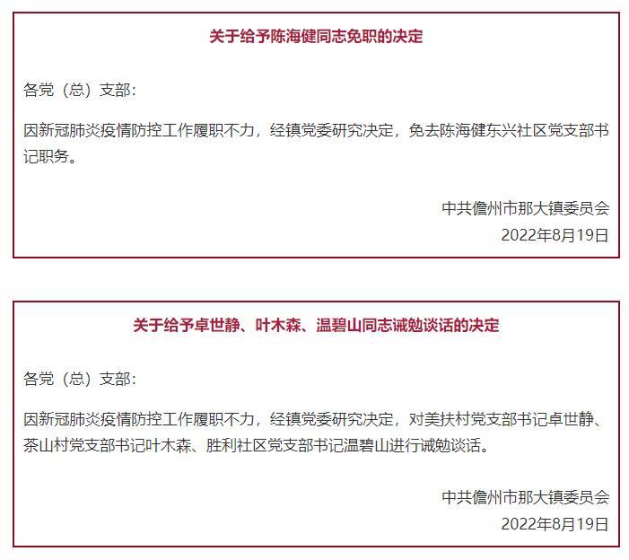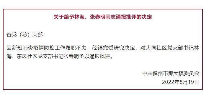 8月20日,海南儋州市委宣传部发布消息,因新冠肺炎疫情防控工作履职不力,海南儋州那大镇多名干部被问责,详情如下: