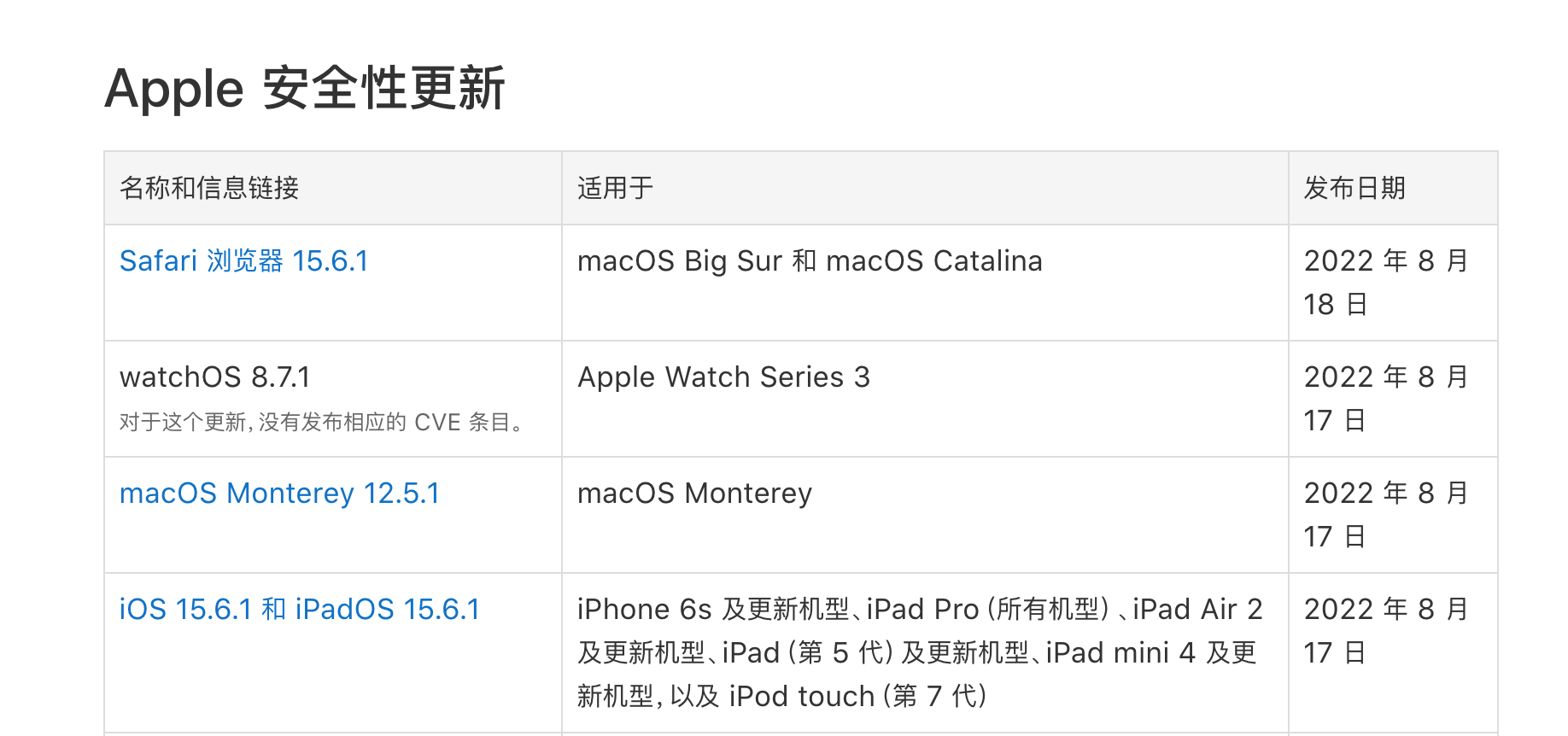 记者注意到,8月17日和8月18日,苹果中国官方发布密集的安全性更新,包含iOS 15.6.1、iPadOS 15.6.1、macOS Monterey 12.5.1、watchOS 8.7.1以及Safari 浏览器 15.6.1。