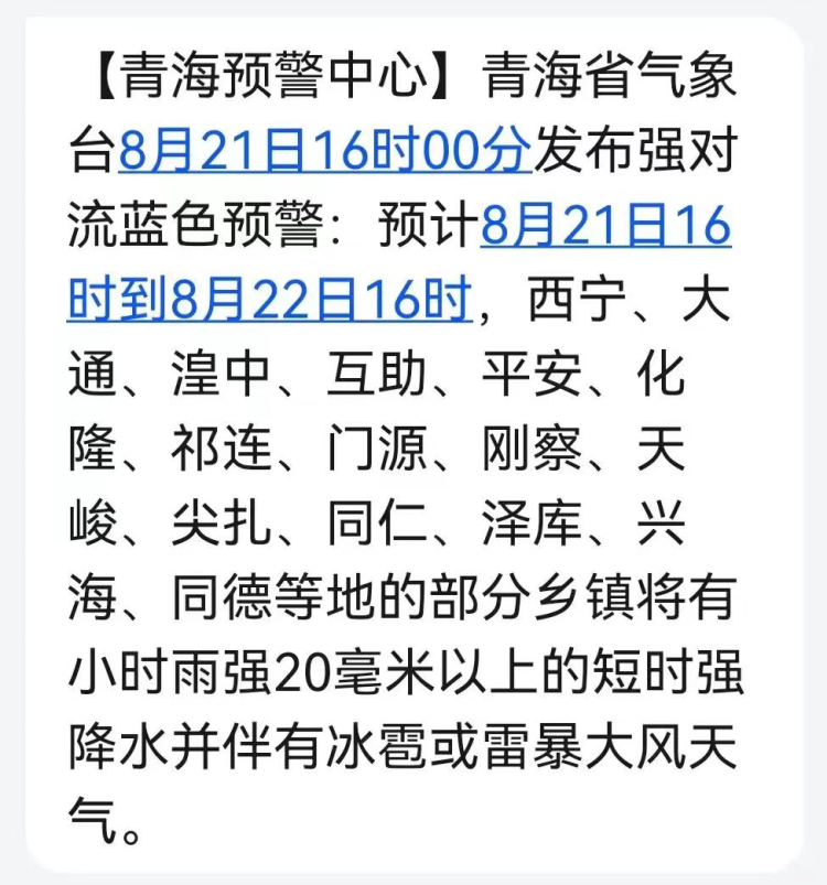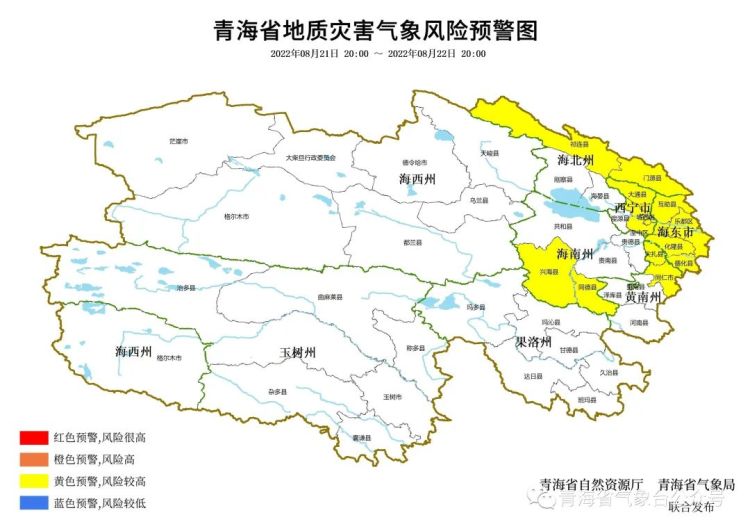 2022年08月21日20:00至2022年08月22日20:00,西宁市,海东市,海北州祁连县、门源县,黄南州同仁市、尖扎县,海南州兴海县、同德县等部分地区地质灾害气象风险较高(黄色预警)。请密切关注雨量情况,加强监测巡查,做好地质灾害防范工作!