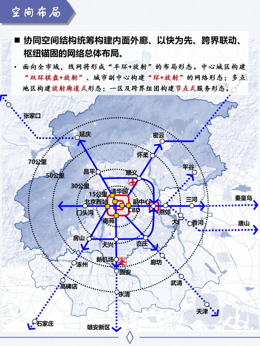 用更强的服务优化运营网络布局。围绕首都高质量发展,分层构建“内面外廊”的轨道交通服务布局。在中心城区中心地区、城市副中心提供面状服务,结合通勤主导方向、区位与功能特征为多点新城提供廊道式服务,围绕廊道集聚城市功能,引导城市集约化簇轴式发展,提升发展效能。