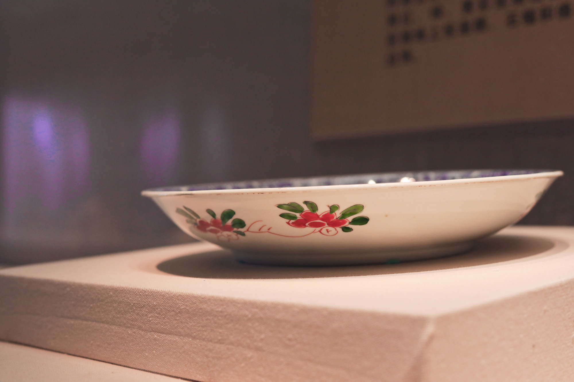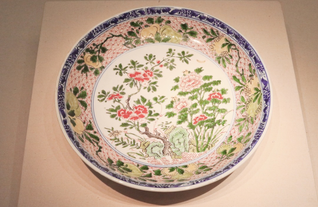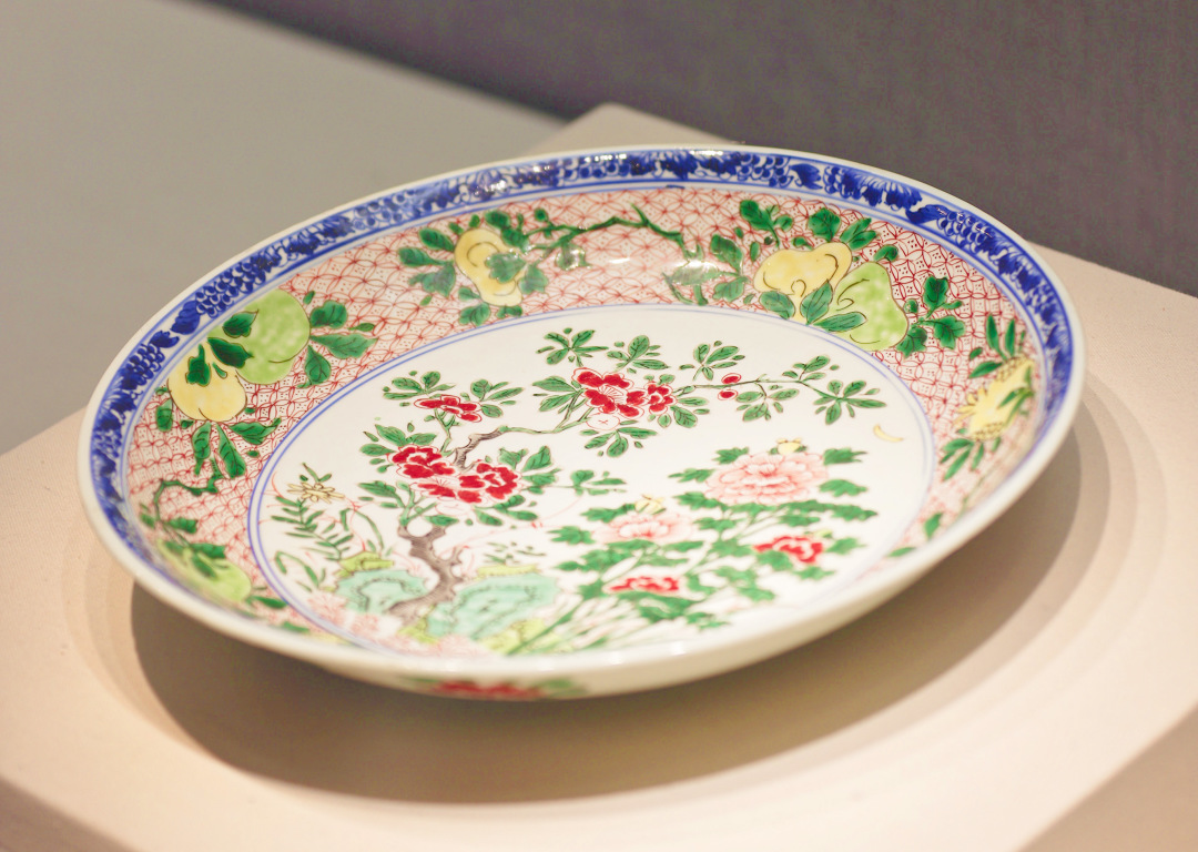 敞口,弧腹,圈足。口沿以釉下青花作为蓝彩装饰轮廓,内壁绘有桃、石榴等折枝瓜果,外壁绘折枝花卉纹。盘心用红、绿、黄彩绘画山石、牡丹,牡丹生长于石畔,枝叶舒展,姿态优美,花色艳丽。构图疏密有致,整齐中富有变化,整幅画面一片春意盎然的景象,代表了富贵吉祥的美好寓意。
