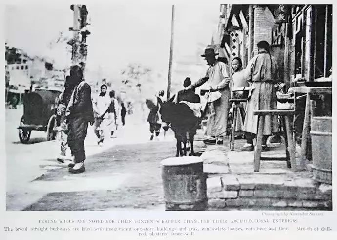 1907年,在西直门内大街北侧的便道上,向西拍摄的照片。