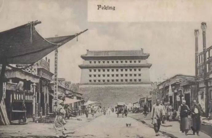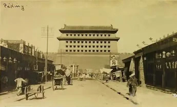 1920年左右在西直门外,从西南向东北拍摄的西直门箭楼。看照片上箭楼南侧的下面,就是店铺一家挨着一家,看有一家店铺门外挂着两个幌子,这应该是一家卖面条的饭馆。