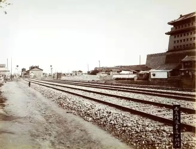 1919年左右在西直门外的铁路西侧从西南向东北方向拍摄的照片,在照片的右侧能够看到半个西直门箭楼,在照片左侧是从西直门火车站铺设过来的两条铁路,左侧是通往门头沟的铁路,右侧是当时新铺通的从西直门到西便门的铁路联络线。