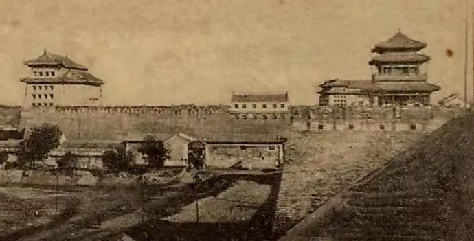 1900年至1905年期间,在西直门外的护城河西岸往东北方向拍摄的西直门箭楼、城楼和瓮城,通过这张照片可以清楚的看到西直门的瓮城西北、西南两侧都是直角的,不像其它城门的瓮城向一轮弯月,是半圆的。东直门和西直门的瓮城是直角的,看老地图,在元朝就是了。但是老百姓仍然管西直门瓮城的城墙叫月墙儿,月墙两边的街道也是叫月墙儿街。