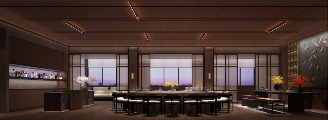 按照规划,“空中四合院”餐厅提取了“全聚德金”、“宫廷红”等色彩,选用金属、木、皮革、 肌理漆、布、青砖等材质,彰显时尚与艺术。通过各个包间打造的四合院聚落,重庭院,一步一景,层层递进。同时,极具表演性及观赏性的烤鸭明档展示区,将充分展现全聚德传统的“明火、挂炉”烤鸭技术。