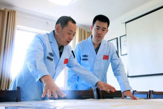 卞韩城(左)与科研人员研讨业务。酒泉卫星发射中心供图